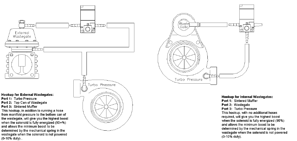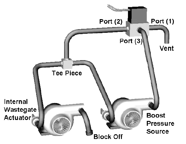 A solenoid operated 3 port spool valve is commonly used for high performance boost control.