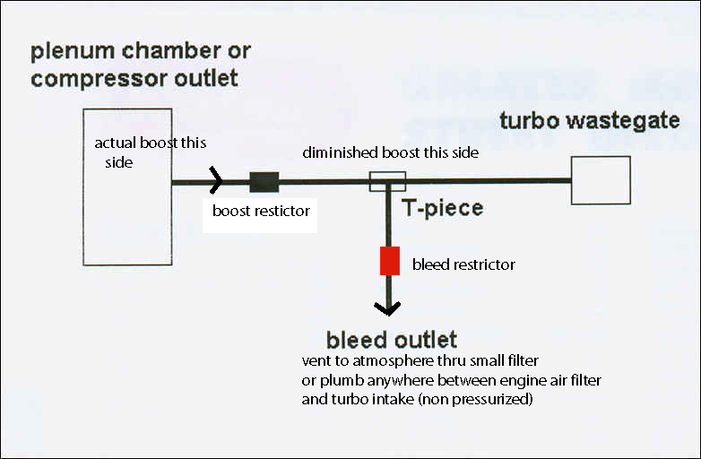 What happens in the method above is that say 10 psi boost pressure is on the left side of the restrictor, and due to the restictor there is a pressure drop across the restrictor of 3 psi . This lets the wastegate feel 7 psi when boost is actually 10 psi. The restrictor must be sized to equate to a 3 psi pressure drop. The bleed outlet restrictor will always need to be slightly larger (less restrictive) than the boost restrictor . Mig welding nozzles come in convenient sizes to use as restrictor "pills". 0.035" orfices are about the sizes commonly used. If there was no outlet restrictor there would just be zero pilot pressure because everything would be effectively open to the atmosphere.